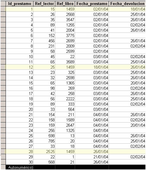 La tabla prestamos es básica en el control de la biblioteca, se pueden realizar consultas para saber qué libros están pendientes de devolución, qué lectores son los más activos, qué ha leído cada lector, qué libros son los más solicitados, podemos diseñar un control que nos avise si ha pasado un determinado tiempo y el libro está todavía sin devolver.....